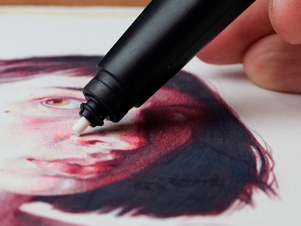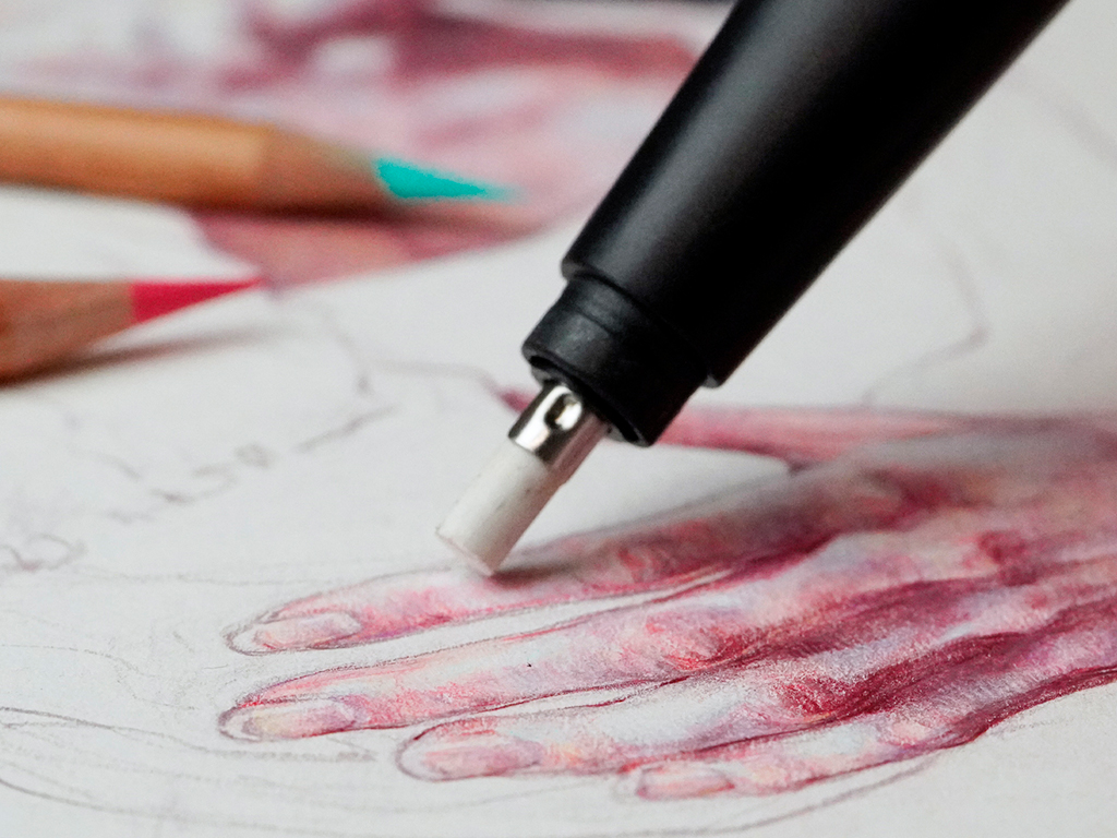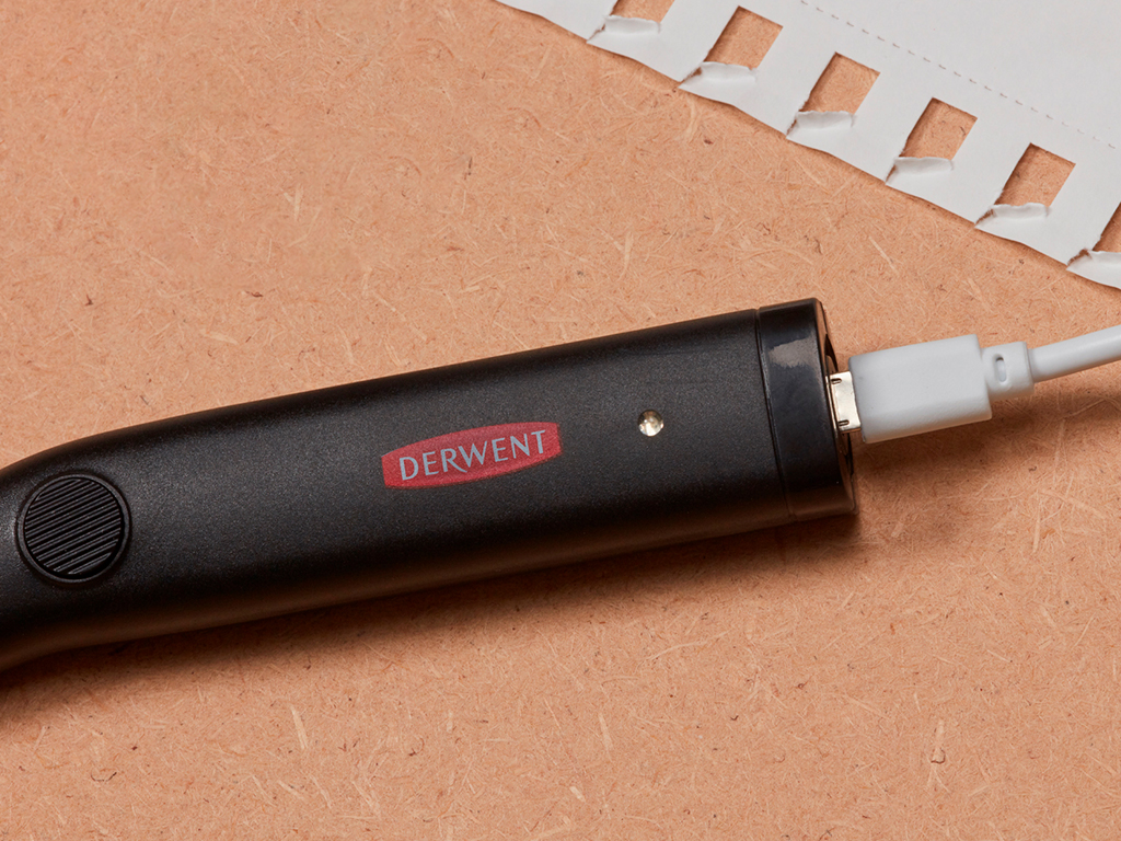 Derwent battery eraser is ideal for creating unusual effects and for experimenting with different drawing techniques. It can of course be used to rub out unwanted marks too! When the eraser is switched on, the spinning action of the eraser lifts pigment from the paper. The precise control offered by the eraser makes it suitable for highlighting and refining marks and amending small areas of work. USB rechargeable eraser comes with a built-in 500mAh lithium-ion battery which is recharged by USB for convenience and long lasting charge, no need to change batteries. Includes a USB charging lead and 20 erasers refills, (10 large erasers 5mm & 10 extra fine eraser 2.4mm diameter). The extra fine eraser is perfect for fine hair line erasing for detailed artwork and technical drawing. The function button is designed to push on and off when required, allowing your hand to hold freely for maximum control.