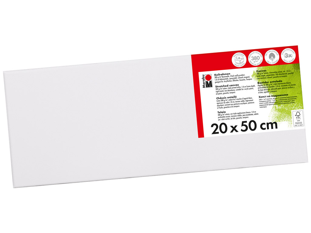 High-quality Marabu stretched canvas is 100% cotton (380g/m²), triple primed and back-stapled to the frame. Base coat is white and lightly absorbent. Particularly sturdy frame is 1.8cm deep and made of FSC certified pine wood. Suitable for acrylic, oil, gouache/tempera paints. Whether it’s brushes or palette knives, bring it on boldly and experience the thrill of the fill! Wood keys included.