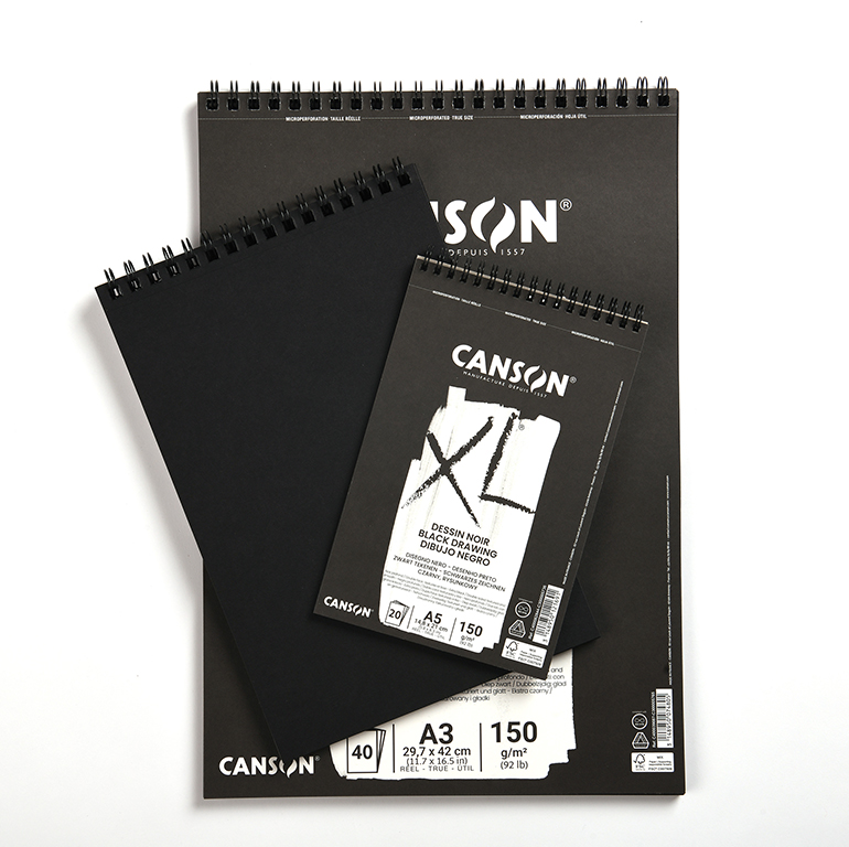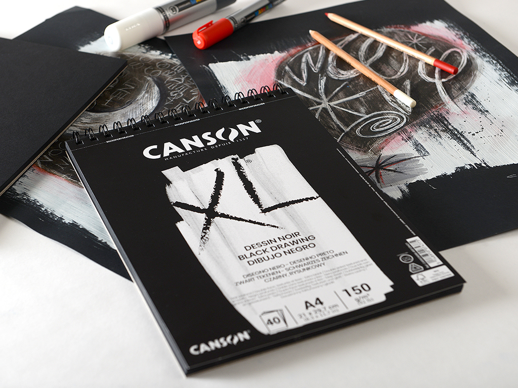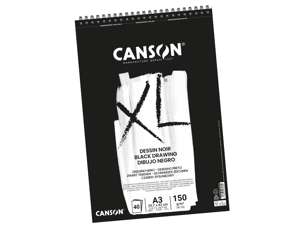 Eskizų bloknotų popierius „Canson XL Dessin Black Sketch Pads“ yra dažytas celiuliozės būdu sodria, tamsiai juoda spalva, todėl puikiai tinka piešti pieštukais, pastelėms, anglimi, rašikliais ir žymekliais. Be rūgščių, dvipusis, abi pusės yra šiek tiek skirtingos lygios tekstūros, puikiai tinka eskizams ir piešimui. Tinka mokiniams ir studentams, yra labai atsparus trynimui ir gramdymui, todėl užtikrina patvarumą ir tinka daugkartiniam naudojimui.