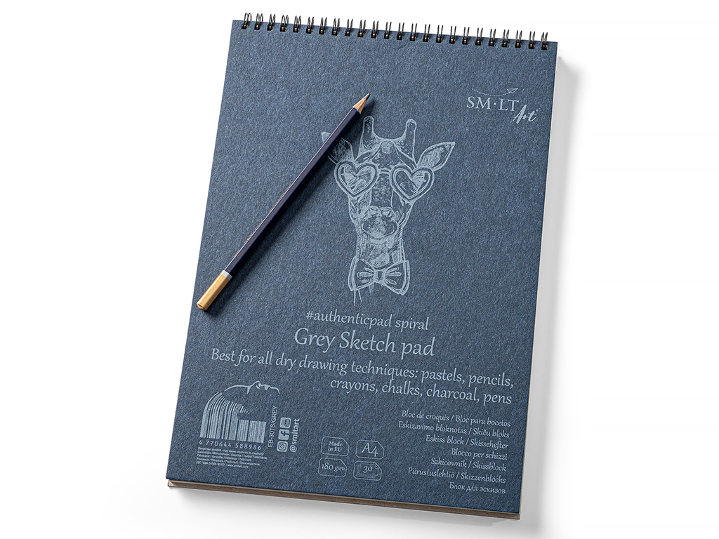Smlt Art Authentic skiču bloks ar papīru pelēkā tonī, kas nesatur skābi, ir ideāli piemērots visām sausajām zīmēšanas tehnikām — ar zīmuļiem, pasteļiem, krītiņiem, krītam, oglēm, pildspalvām un citiem materiāliem. Papīra sastāvā esošā kokvilna piešķir vieglu tekstūru un palielina izturību, savukārt tīrās celulozes šķiedras nodrošina apjomu un stiprību. Blokam ir spirālveida iesējums un mikroperforētas lapas ērtai noplēšanai.