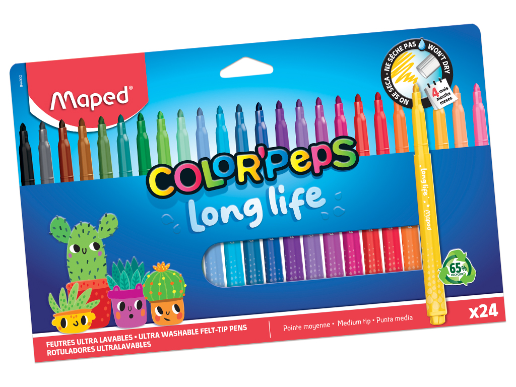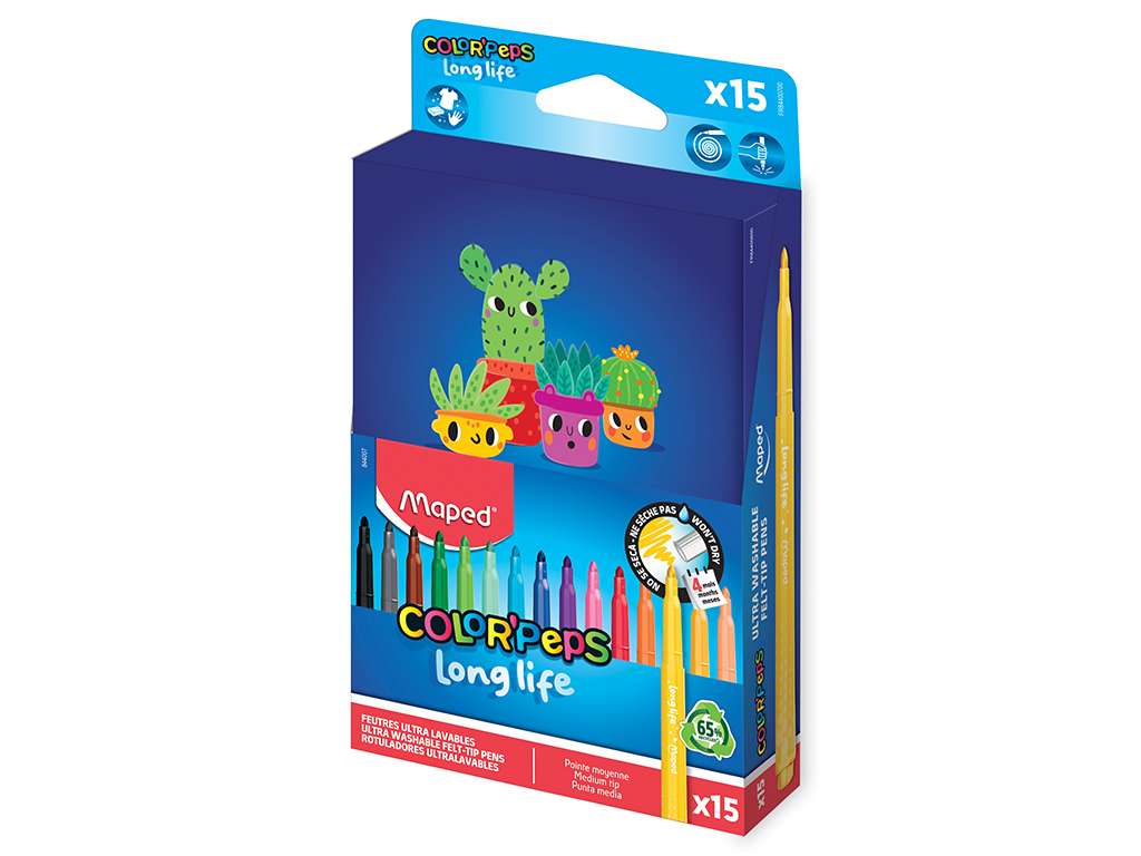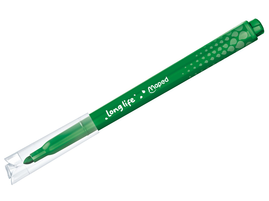 Viltpliiats, mis ei kuiva ilma korgita isegi kuni 4 kuu jooksul! Maped Long Life 2 viltpliiatsid on erksate värvidega ja kestavad tõeliselt kaua. Enamus tekstiilidelt ja nahalt lihtsasti mahapestav. Fikseeritud koonilise otsaga (d=3,6mm). Plastikust osad sisaldavad vähemalt 65% taaskasutatud materjale.